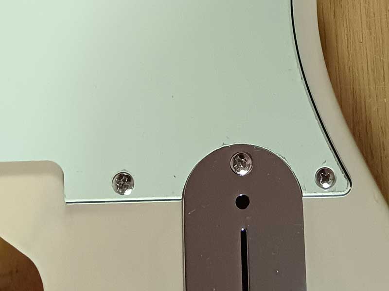 See picture 2 - the right hand screw is this model. The other two screws are the standard pickguard screw. Note how it better sits in the countersink of a Fender pickguard.